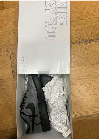 Zapatillas Nike Air Force 1 personalizadas. - Diseño único By You. - Combinación de colores gris y negro.