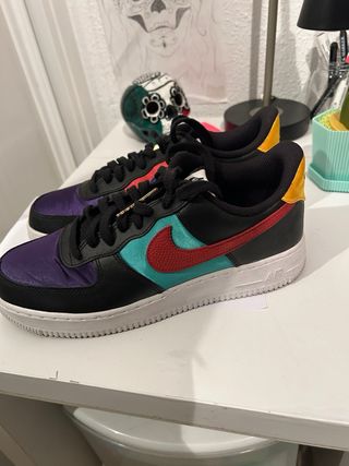 Zapatillas Nike Air Force 1 con un diseño vibrante y moderno. - Combinación de colores llamativa. - Detalles en rojo, turquesa y morado. - Talón y puntera con toques de amarillo.