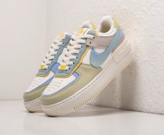 Zapatillas Nike Air Force 1 Shadow para mujer con un diseño moderno y colorido. - Combinación de blanco, azul claro, verde menta y amarillo pálido. - Detalle de swoosh en azul claro. - Plataforma característica de las Shadow.