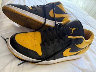 Zapatillas deportivas Air Jordan 1 Low en talla 43. Combinan un diseño clásico con colores llamativos. - Parte superior de cuero negro y detalles en amarillo. - Suela de goma para mayor tracción. - Logo de Jordan en la lengüeta.