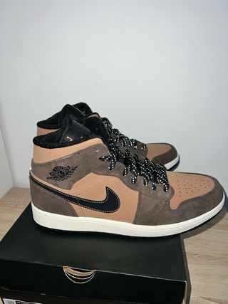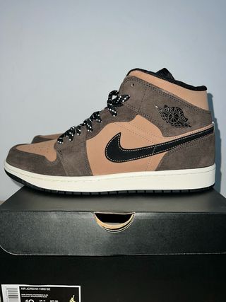 Zapatillas Jordan 1 Mid Se con una combinación de colores marrón y negro y blanco, compradas en la página de Nike. - Diseño de media caña. - Cordones a contraste. - Parte superior de gamuza y piel. - Suela de goma.