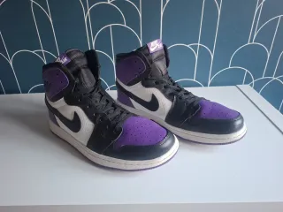 Zapatillas altas Nike Air Jordan 1. - Combinación de colores morado y blanco. - Diseño icónico de baloncesto.