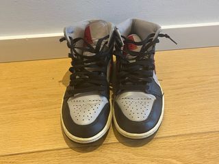 Zapatillas deportivas Nike Air Jordan 1. - Diseño clásico en blanco y negro y gris. - Cordones blancos. - Logo de Jordan en rojo. Estan con polvo de lo guardado.