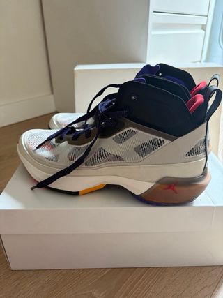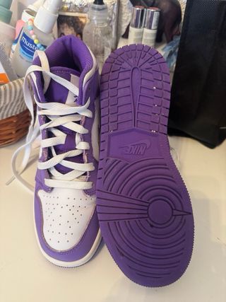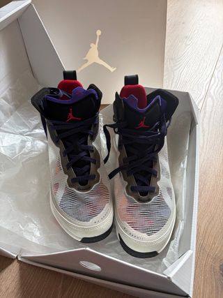Zapatillas altas de la marca Jordan. - Diseño con paneles transparentes. - Cordones morados. - Detalle de logo Jumpman en rojo. - Incluyen caja original. - Nunca se han usado.
