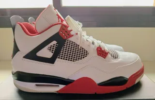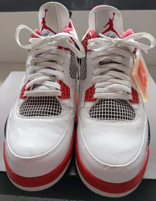 Zapatillas Nike Air Jordan 4 en el color Fire Red en la edición del año 2012 usadas sólo en dos ocasiones, en buen estado y usables bajo la responsabilidad del comprador, aunque con crackeo en la pintura de los laterales en la parte negra y en la midsole blanca que se puede ver en las fotos. Zapatillas originales compradas en EBay a vendedor con 100% de votos positivos y casi cuatro mil zapatillas vendidas.