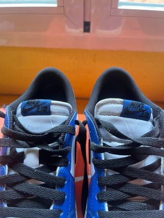 Zapatillas deportivas Nike Air Jordan 1 para hombre. - Diseño clásico en azul y blanco. - Cordones negros. - Puntera perforada.