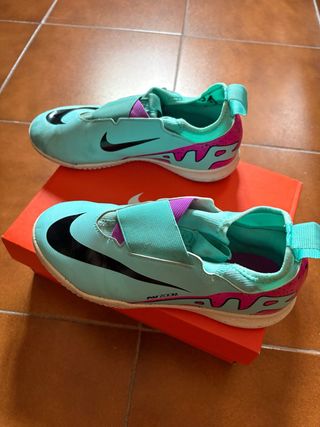 Zapatillas deportivas Nike Air Zoom Mercurial en talla 36. Diseño moderno y llamativo. - Color principal turquesa con detalles en rosa. - Cierre de velcro para un ajuste fácil. - Suela con tecnología Air Zoom.