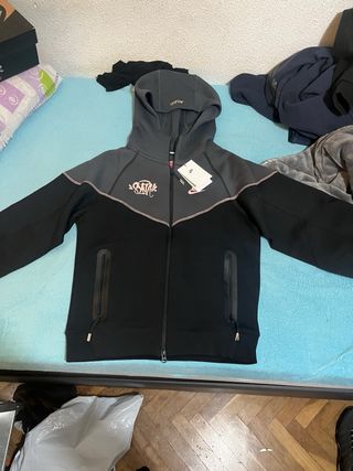 Conjunto deportivo Nike Tech Fleece Syna en color negro con detalles en rosa, a juego con las zapatillas Air Max 95 Syna. - Sudadera con capucha. - Pantalón de chándal. - Zapatillas Air Max 95 Syna. - Caja original de las zapatillas. - Zapatillas talla 42
