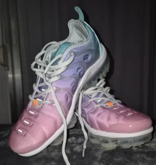 Zapatillas Nike Air Vapormax Plus con un degradado de colores pastel. - Diseño degradado de rosa a morado y azul. - Suela con tecnología Vapormax. - Cordones grises.