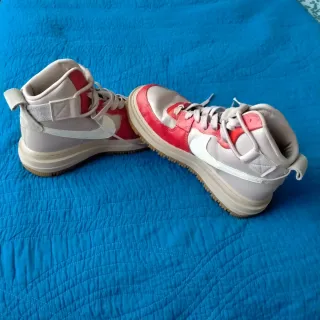 Zapatillas altas Nike con un diseño moderno y llamativo. - Combinación de colores beige y rojo. El color rojo es pintado para darle un acabado exclusivo. - Detalle de swoosh blanco. - Cierre con cordones. En perfecto estado.