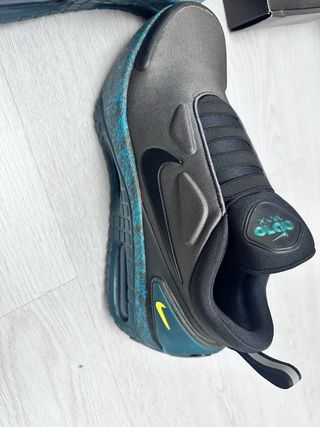 Zapatillas Nike Adapt Auto Max en color negro y teal. Diseño moderno y llamativo. - Sistema de ajuste automático. - Unidad Air Max visible en la suela. - Detalles con patrón de líneas azules. -aplicacion exclusiva para ellos! -Negociable