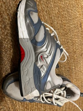 Zapatillas deportivas Nike Air en tonos plateados y azules. Perfectas para el día a día o para hacer deporte. - Diseño moderno y cómodo. - Suela con buen agarre. - Cierre con cordones.