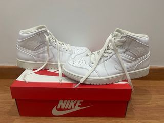 Zapatillas de caña media Nike Air Jordan 1 en color blanco. - Diseño clásico y versátil. - Detalles de perforaciones en la puntera. - Swoosh lateral característico. - Dos usos, están como nuevas