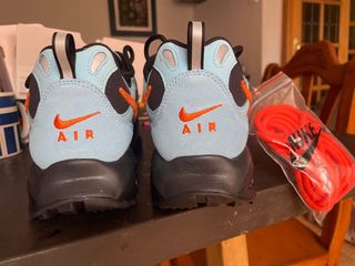 Zapatillas deportivas Nike Air Max 98 con un diseño llamativo y moderno. Talla 38,5. Se puede ver el poco uso que tienen, las suelas no tienen desgaste. - Combinación de colores blanco, naranja, morado y verde azulado. - Cordones de color verde azulado. - Detalle de swoosh plateado en el lateral.