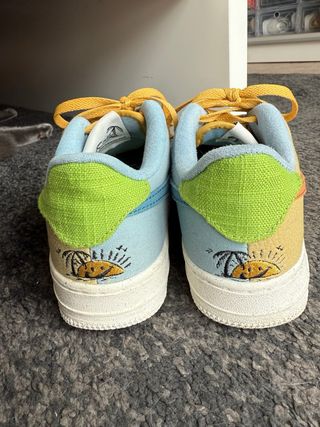 Zapatillas deportivas Nike con un llamativo diseño. - Combinación de colores amarillo y azul. - Detalles con estampado de estrellas y bandera americana. - Suela con tecnología Air Max visible. - Talla 38 pero da menos talla como un 37. - Tiene un pequeño levantamiento del tejido de ahí su precio.