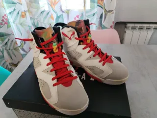 Zapatillas Nike Air Jordan 6 Retro. - Diseño con paneles en beige, blanco y detalles multicolor. - Cordones rojos vibrantes. - Suela con toques rojos.