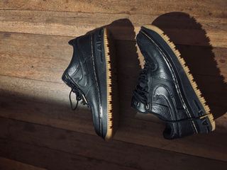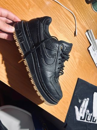 Zapatillas Nike Air Force 1 original con un diseño clásico y moderno. - Exterior de cuero negro. - Suela de goma en color marrón. - Detalle de costuras visibles.