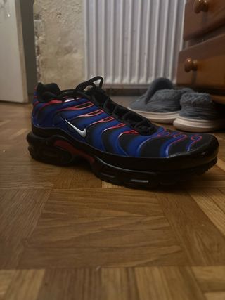 Zapatillas Nike TN Air Max Plus 1 con un diseño llamativo. - Combinación de colores azul y rojo. - Detalle de Swoosh plateado.
