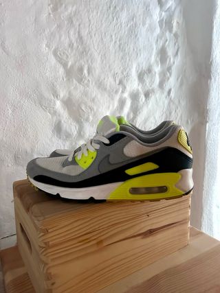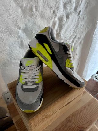 Zapatillas deportivas Nike Air Max 90 con un diseño moderno y llamativo. Nuevas a estrenar primeras calidades Todos los productos son ORIGINALES Cualquier duda pregunta sin compromiso Envío con rapidez Posibilidad de entrega en persona en MADRID Dispongo TICKEC de compra Caja sin tapa - Combinación de colores gris y naranja. - Detalle de swoosh en color verde lima. - Unidad Air visible en la suela.
