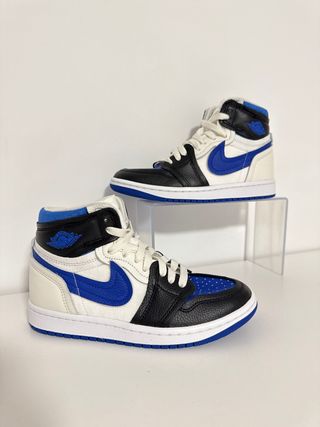 Nike Air Jordan 1 Mid (GS) blanco y racer blue Talla 39 (GS) talla como 39 normal/holgado Usados, NO SOY RESELLER! Estado: 7'5/10 buen estado; tienen señales de uso a ver en las fotos: un poco de crease y ligeras manchas de roce sobre todo en el tejido interno (bolitas) aún se les puede dar perfectamente una segunda vida Tambien tengo la caja + cositas en mi perfil