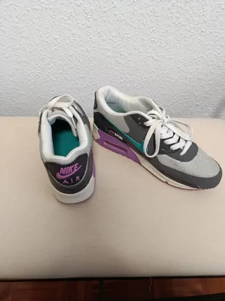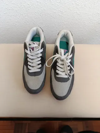 Zapatillas deportivas Nike Air Max con un diseño moderno y cómodo. Dan poca talla - Combinación de colores gris y verde azulado. - Cierre con cordones blancos.