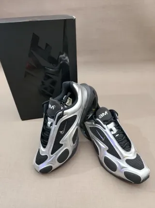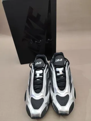 Zapatillas deportivas Nike Air Max Muse con un diseño moderno y llamativo. - Combinación de colores plata y negro. - Detalle de logo Swoosh en los laterales. - Cierre de cordones.