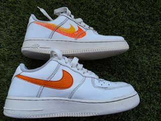 Zapatillas deportivas Nike Air Force 1 con un diseño llamativo. - Combinación de colores naranja y blanco. - Detalle en naranja. - Estilo clásico Air Force 1.