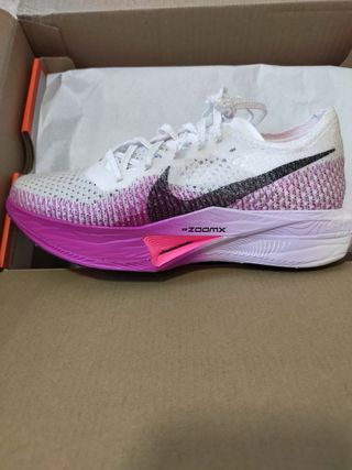 Zapatillas de running Nike ZoomX Vaporfly Next% 3. - Diseño en blanco y rosa. - Tecnología ZoomX. Están sin utilizar, ya que las pedí por una pagina pero me cobran muchos gastos de envío, me quedan un poco pequeñas.