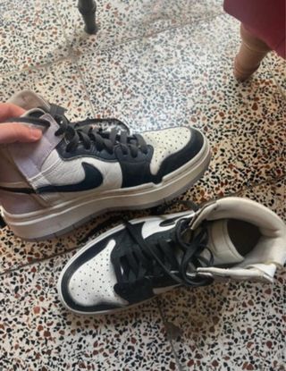 Zapatillas Nike Dunk High en blanco y negro. Ideales para un look casual. - Son de caña alta. - Tienen cordones negros. - Están en buen estado, aunque presentan ligeras señales de uso.