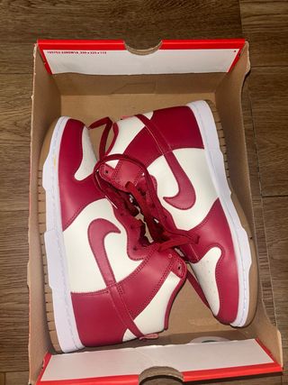 Vendo un par de zapatillas Nike de color rojo y blanco, talla 41. Son zapatillas altas, con cordones blancos. Están usadas, pero en buen estado. - Modelo clásico de Nike. - Diseño bicolor. - Suela ligeramente desgastada.