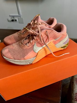 Zapatillas deportivas Nike Metcon 7 en tonos rosados y naranjas. - Diseño de malla transpirable. - Detalle de Swoosh en blanco. - Suela con amortiguación. - Cierre de cordones.