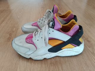 Zapatillas deportivas Nike Huarache con un diseño moderno y llamativo. - Combinación de colores vibrantes: blanco, rosa, naranja y amarillo. - Estilo urbano y cómodo. - Materiales de calidad.