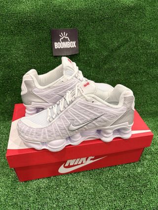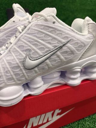 Zapatillas Nike Shox TL en color blanco con detalles plateados. Un diseño icónico y moderno. - Parte superior de malla transpirable. - Sistema de amortiguación Shox. - Detalles plateados en el talón y el Swoosh.