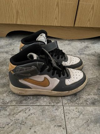 Zapatillas de caña media Nike Air Force 1. - Combinación de colores gris, blanco y naranja. - Cierre de velcro en el tobillo. - Suela con tecnología Air.