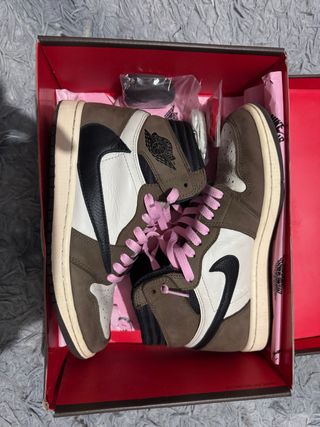 Zapatillas Nike Air Jordan 1 edición especial Travis Scott. Un diseño icónico con una combinación de colores única. - Parte superior de cuero en tonos marrón y blanco. - Swoosh lateral en negro. - Cordones en color rosa. - Suela de goma. - Incluye caja original.