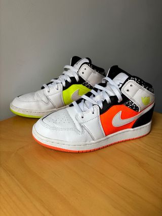 Vendo Nike Air Jordan 1 Mid originales en combinación blanco con detalles en amarillo flúor y naranja. Modelo muy llamativo y diferente, perfecto para outfits urbanos y streetwear. 👟 Talla: 38 📌 Estado: buen estado general (ver fotos).