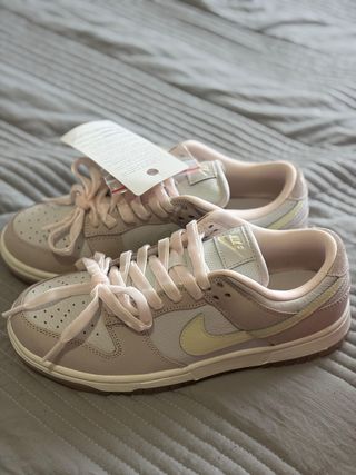 Zapatillas Nike Dunk Low en tonos beige y rosa. Ideales para un look casual y elegante. - Son de piel. - Están nuevas, con etiquetas. - Incluye dos pares de cordones.