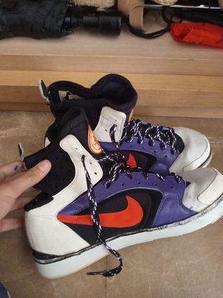 Se venden zapatillas Nike de bota altas. Son de color blanco y morado, y tienen un diseño llamativo. - Ideales para un look deportivo y casual. - Están en buen estado, aunque muestran señales normales de uso. - Se incluyen dos zapatillas.