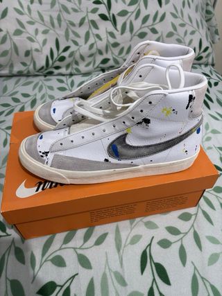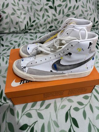 Zapatillas altas Nike Blazer con un diseño único y detalles de pintura. - Parte superior de cuero y ante. - Swoosh lateral en gris oscuro. - Cordones blancos. - Suela de goma. - Estilo deportivo y casual.