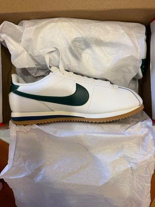 Zapatillas Nike Cortez de estilo clásico. Nuevas a estrenar, con caja, factura y etiquetas, todo ORIGINAL - Diseño en blanco con detalles en verde. - Suela de goma. - Cierre con cordones.