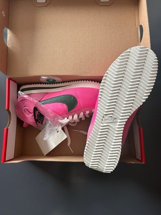 Zapatillas Nike Cortez a estrenar. - Color principal rosa vibrante. - Detalle del logo Swoosh en verde oscuro. - Cordones blancos. - Suela de goma blanca.