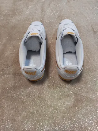 Zapatillas Nike Cortez con un diseño clásico y elegante. - Combinación de blanco y detalles dorados. - Suela de goma. - Logo de Nike en los laterales.