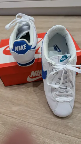 Zapatillas Nike Cortez clásicas en blanco con detalles en azul. Usadas 2 veces