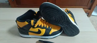 Sólo usadas una vez. Zapatillas altas Nike Dunk High Retro en colores negro y amarillo. - Diseño icónico de Nike. - Cordones amarillos. - Suela blanca y negra.