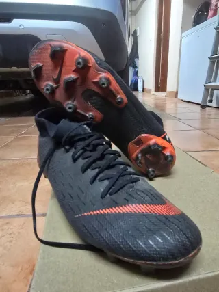 Zapatillas de fútbol Nike con tacos, ideales para jugar en césped. - Diseño en color negro con detalles en naranja. - Cierre con cordones negros.