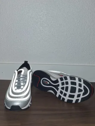 Zapatillas deportivas Nike Air Max 97 con un diseño llamativo. - Combinación de colores plata y rojo. - Detalles reflectantes en las líneas. - Suela de goma con buen agarre.