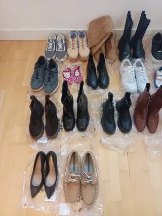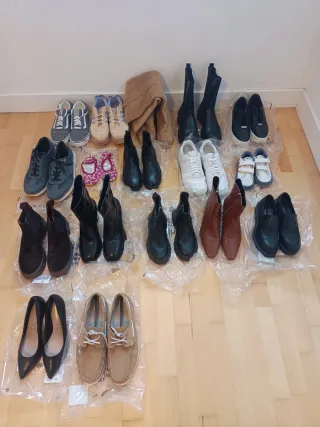 Lote variado de calzado que incluye zapatillas deportivas y botines. - Zapatillas deportivas grises y negras. - Zapatillas deportivas beige y azules. - Botines negros. - Botines marrones. - Zapatos planos negros. - Zapatos náuticos marrones. - Zapatillas blancas. - Zapatillas negras. - Zapatillas infantiles rosas. - Zapatillas infantiles azules y rojas.