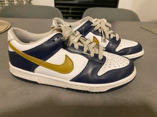 Zapatillas deportivas Nike Dunk Low en talla 38. Combinan paneles en azul marino y blanco con el icónico swoosh en dorado. - Diseño clásico de caña baja. - Cordones de color claro. - Suela de goma blanca.