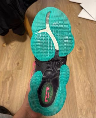 Zapatillas deportivas Nike Lebron 19. - Diseño alto. - Cordones rosas. - Suela con detalles en verde azulado.