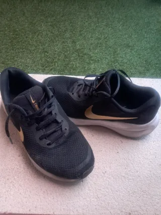 Zapatillas de running Nike Revolution 7 en color negro con detalles dorados, talla 38, unisex, muy poco uso y en muy buen estado salvo un pequeño roce sin rotura en la zapatilla derecha como se puede ver en las fotos por eso el precio. Perfectas para tus entrenamientos. - Diseño moderno y ligero. - Suela de goma para mayor tracción.
